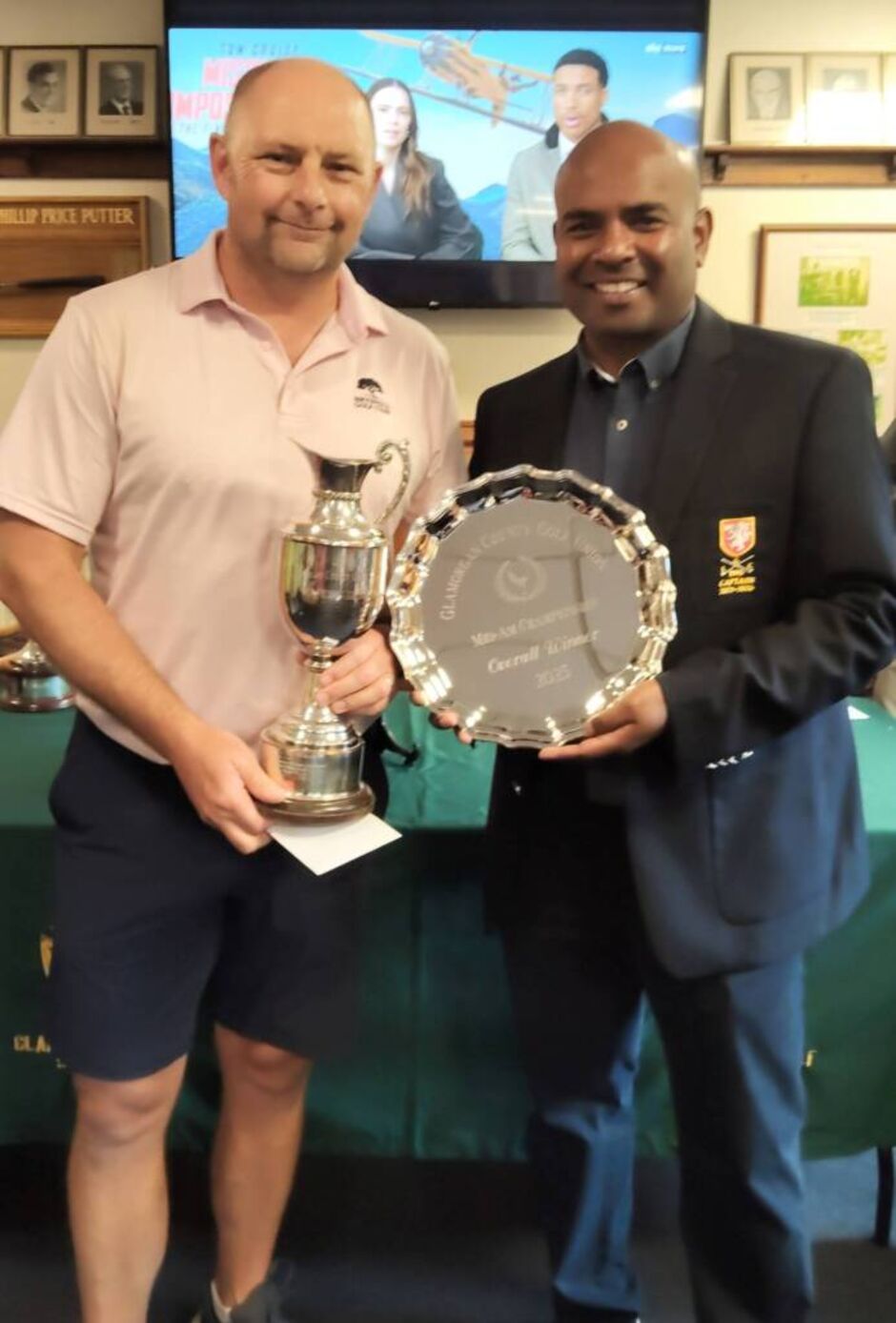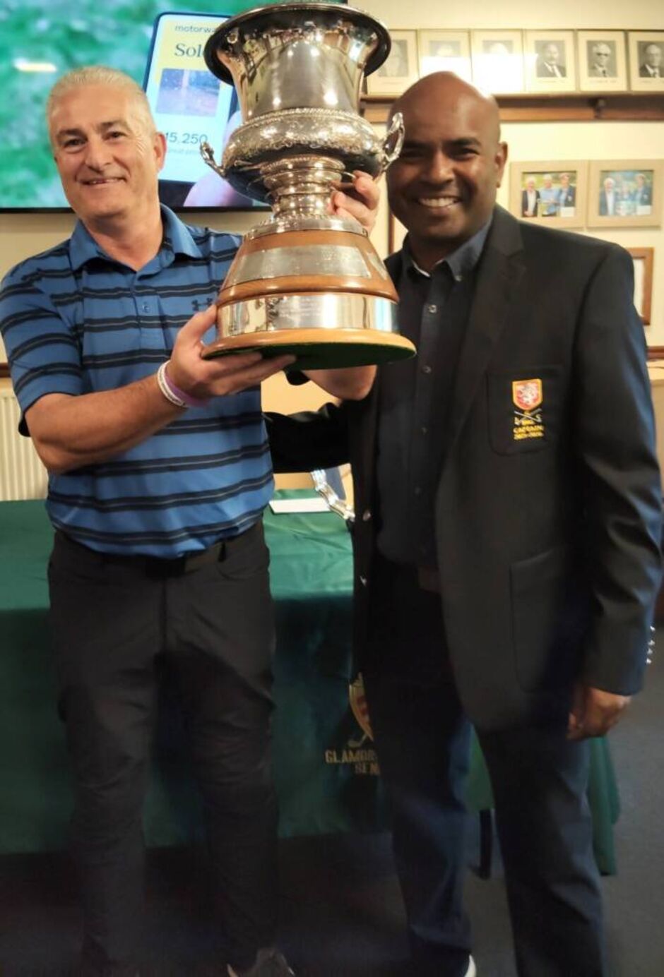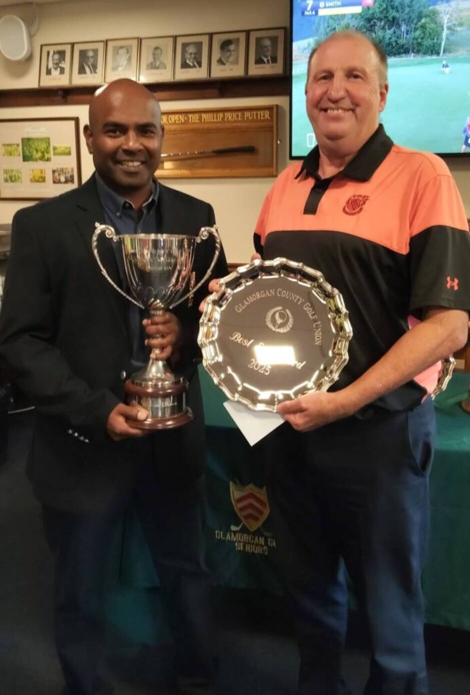 The winners at the Seniors/Mid-am County Championships receive their trophies from Llanishen Captain Ravi Nalliah.