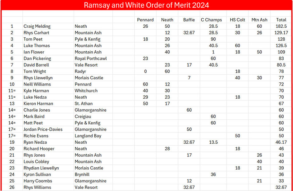 Examples: Four players, A, B, C, and D tie on 146 in the Neath Bell. According to the COC applied by the Neath Club (Count-back). Player A is declared the winner by the Club and receives 60 OOM points. Players B, C and D then receive (50 + 40 + 30) / 3 = 40 points.