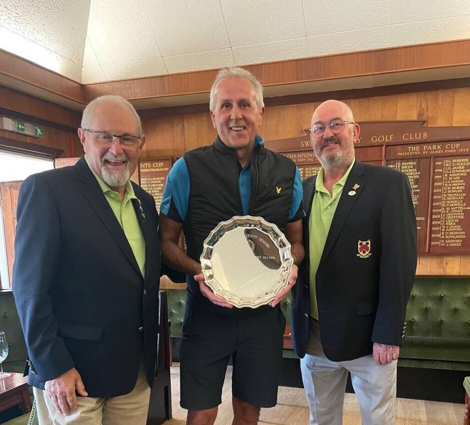 Neil Roderick receives the Peter Austerberry Salver from County President Ed Morgan and County Seniors Chairman Steve Watkins.