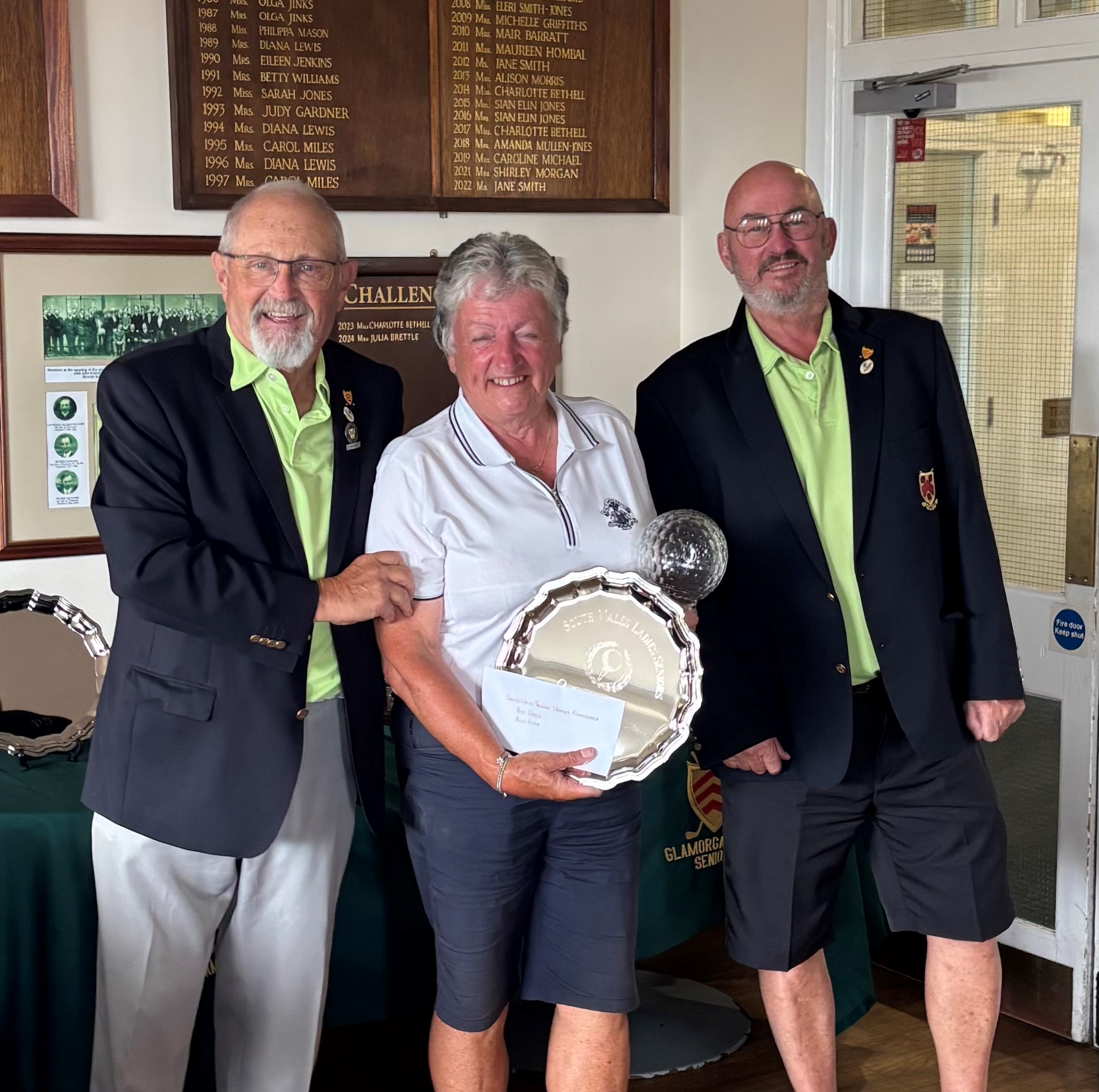 Royal St.Davids golfer Ann Lewis receives the South Wales Seniors Womens Championship trophy from Ed Morgan, President of the Glamorgan County Golf Union, and Steve Watkins, Seniors Chairman of the GCGU.