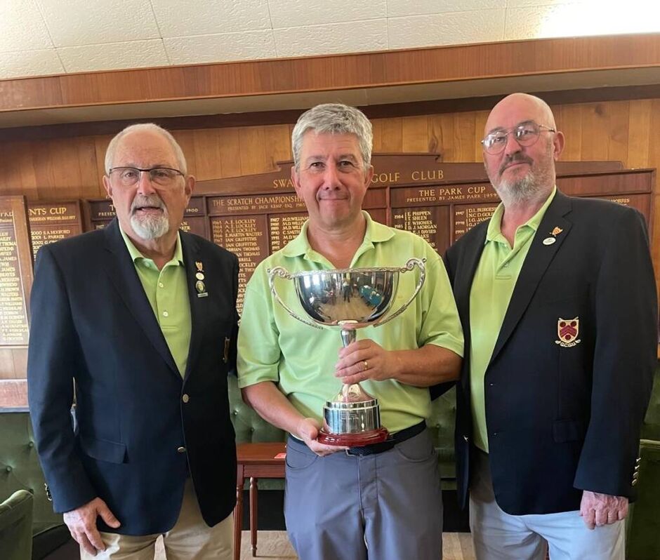 Welsh Seniors International Gwyn Jones receives the Steve Hopkins Trophy from County President Ed Morgan and County Seniors Chairman Steve Watkins. The Steve Hopkins Trophy is presented to the winner of the County Seniors Order of Merit. Gwyn was the County Seniors Order of Merit winner for 2024.