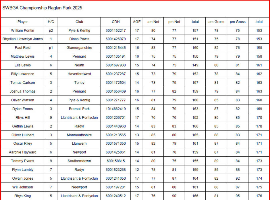 South Wales Boys report Newly-opened Raglan Park Golf Club provided the perfect setting for the 2025 South Wales Boys Championship as the firm and bouncy fairways proved a tricky test for the field. The 36-hole stroke play event was played on day one with Pyle and Kenfig’s William Pontin (153) pipping Rhydian Jones of Brynhill to the title thanks to a better last 18 holes. The two Glamorgan County players were closely followed by Paul Reid (Glamorganshire) and Matthew Lewis (Pennard) on a 158 total. 16 players made it through to the match play stages, with the above four players making up the semi final lineup In the first match Glamorgan County U18 captain Pontin beat his vice captain Matthew Lewis 2+1 with Paul Reid beating Rhydian Jones 3+2. The final between Reid and Pontin turned into an exciting game of matchplay with both players jostling to take control of the match. Reid enjoyed the best of the front nine taking a 1 hole advantage with him into the turn, but it was Pontin who was able to manage both his game and the final stages to perfection hitting three birdies in a row on holes 15,16 and 17 to seal a 3+1 win. For Pontin is was a strokeplay and matchplay double victory.
