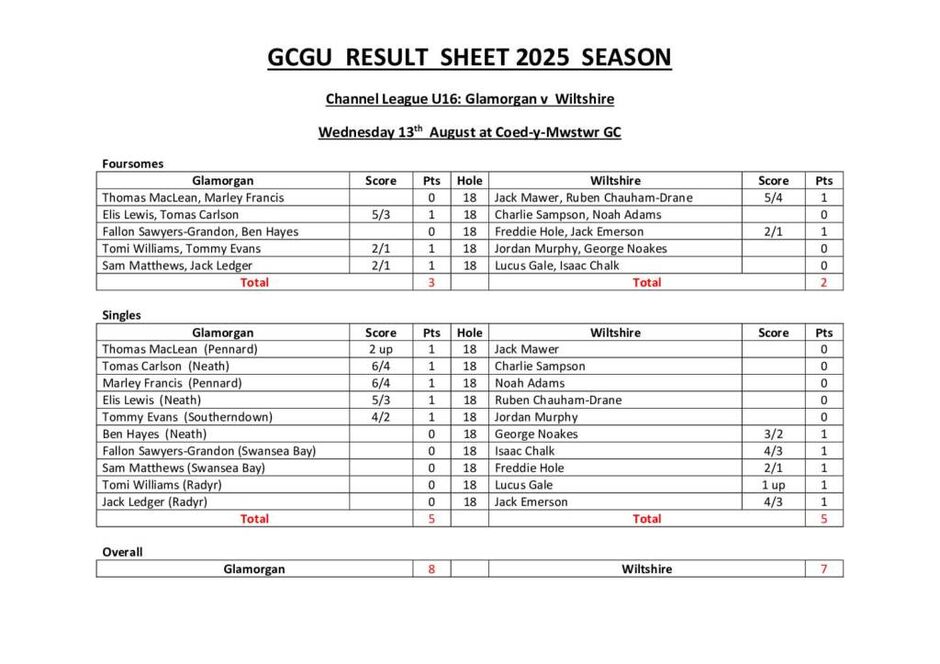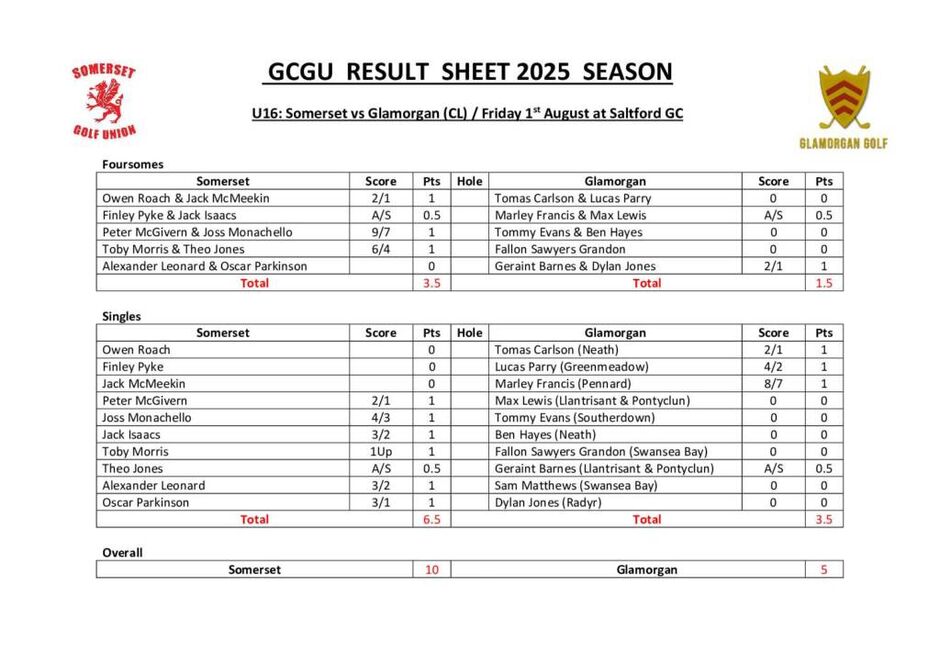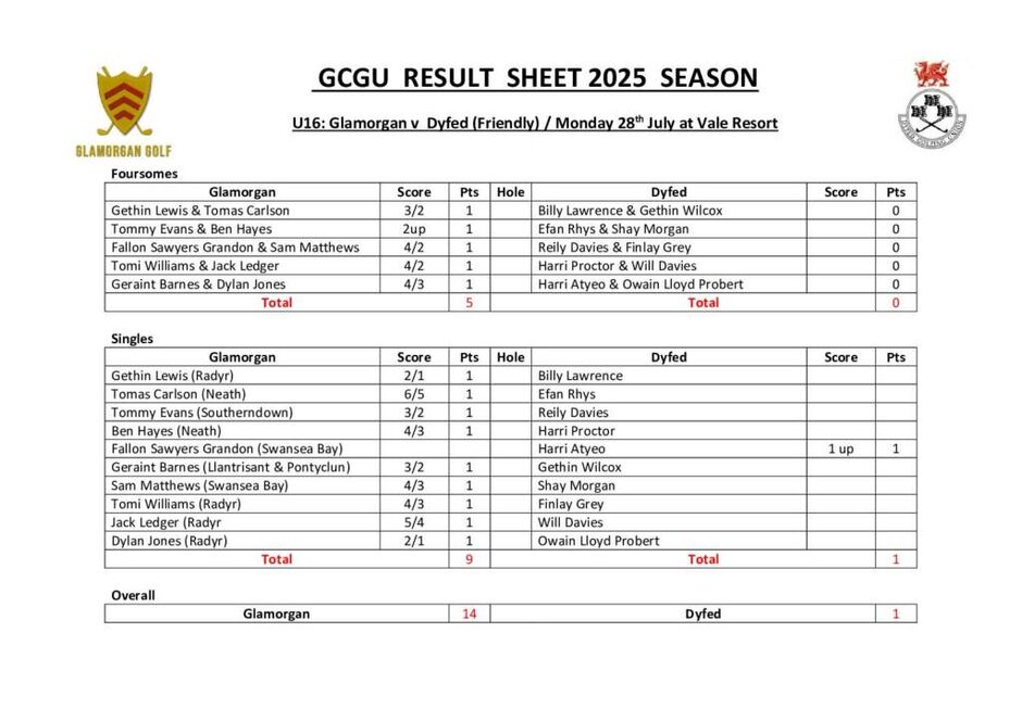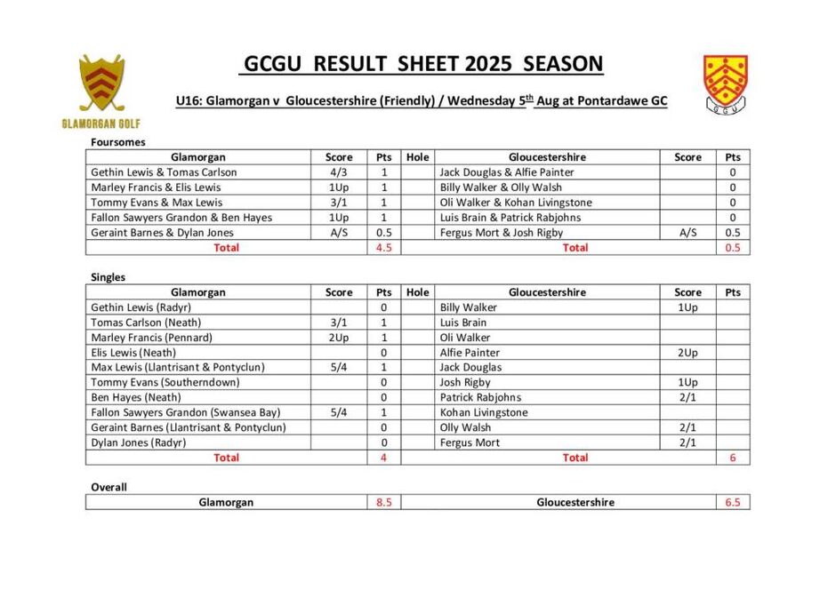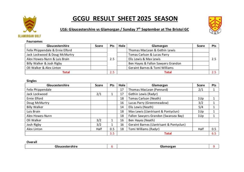 The singles proved to be a closely fought contest, with the majority of matches reaching the final two holes. Glamorgan, however, held their nerve to edge out their opponents, securing 6½ of the 10 points available to claim a well-deserved 9–6 overall victory.