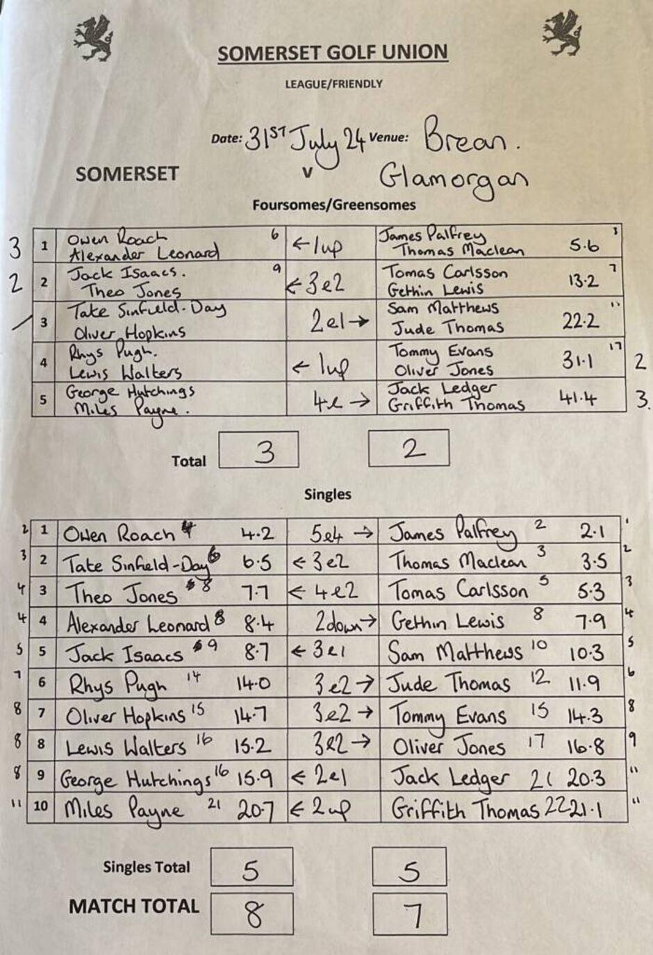 Team captain Gethin Lewis thanked his teammates for a good performance and the Dyfed team for a match played in good spirit and finally thanks to Glyn Abbey for hosting the fixture.