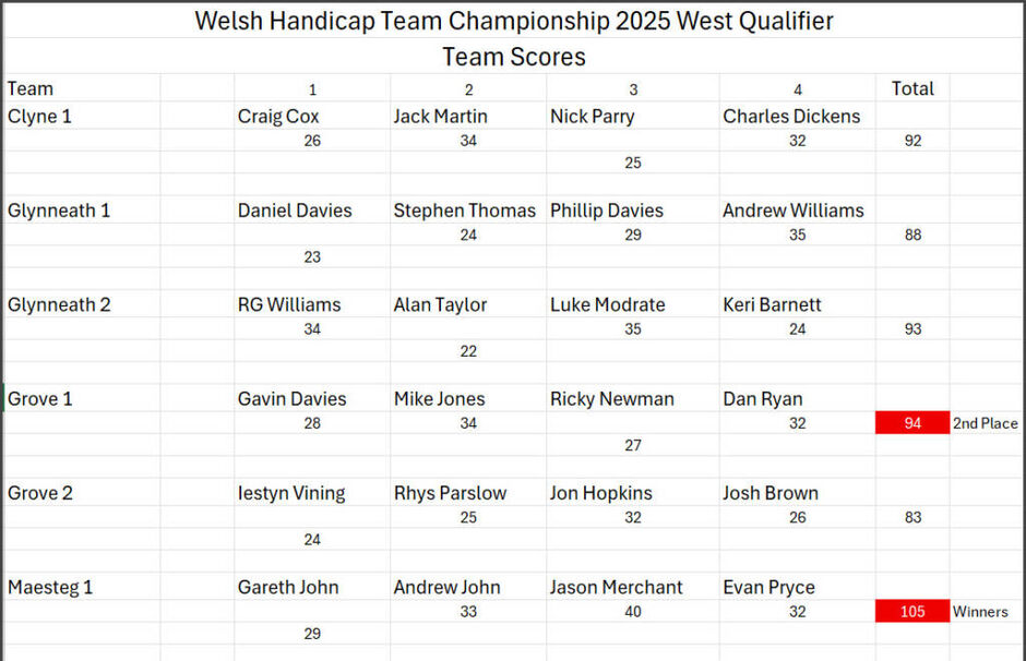 The Welsh Handicap Team Championship West Qualifier was won by Maesteg 1 team. Team members Gareth John, Andrew John, Jason Merchant and Evan Pryce, pictured with County President Ed Morgan, scored 105 points in the best 3 cards out of 4 team event. The Grove 1 team Gavin Davies, Mike Jones, Ricky Newman and Dan Ryan finished in second place on 94 points beating Swansea Bay 1 by virtue of having the highest fourth card score.